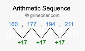 So, what type of sequence is 160, 177, 194, 211? The sequence 160, 177, 194, 211 has a common difference of +17 between each term. We call this kind of sequence an arithmetic sequence. Below is an image illustrating the correlation between the arithmetic sequence 160, 177, 194, 211 and its common difference of +17.