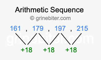 So, what type of sequence is 161, 179, 197, 215? The sequence 161, 179, 197, 215 has a common difference of +18 between each term. We call this kind of sequence an arithmetic sequence. Below is an image illustrating the correlation between the arithmetic sequence 161, 179, 197, 215 and its common difference of +18.