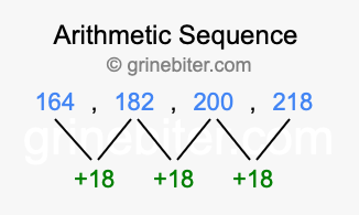 So, what type of sequence is 164, 182, 200, 218? The sequence 164, 182, 200, 218 has a common difference of +18 between each term. We call this kind of sequence an arithmetic sequence. Below is an image illustrating the correlation between the arithmetic sequence 164, 182, 200, 218 and its common difference of +18.