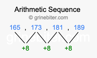 So, what type of sequence is 165, 173, 181, 189? The sequence 165, 173, 181, 189 has a common difference of +8 between each term. We call this kind of sequence an arithmetic sequence. Below is an image illustrating the correlation between the arithmetic sequence 165, 173, 181, 189 and its common difference of +8.