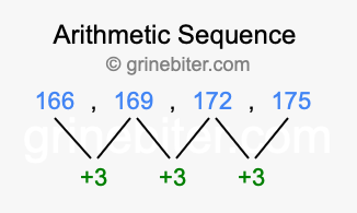 So, what type of sequence is 166, 169, 172, 175? The sequence 166, 169, 172, 175 has a common difference of +3 between each term. We call this kind of sequence an arithmetic sequence. Below is an image illustrating the correlation between the arithmetic sequence 166, 169, 172, 175 and its common difference of +3.