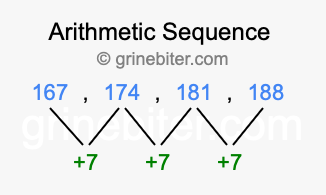 So, what type of sequence is 167, 174, 181, 188? The sequence 167, 174, 181, 188 has a common difference of +7 between each term. We call this kind of sequence an arithmetic sequence. Below is an image illustrating the correlation between the arithmetic sequence 167, 174, 181, 188 and its common difference of +7.