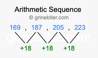So, what type of sequence is 169, 187, 205, 223? The sequence 169, 187, 205, 223 has a common difference of +18 between each term. We call this kind of sequence an arithmetic sequence. Below is an image illustrating the correlation between the arithmetic sequence 169, 187, 205, 223 and its common difference of +18.