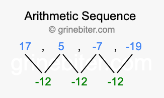 So, what type of sequence is 17, 5, -7, -19? The sequence 17, 5, -7, -19 has a common difference of -12 between each term. We call this kind of sequence an arithmetic sequence. Below is an image illustrating the correlation between the arithmetic sequence 17, 5, -7, -19 and its common difference of -12.