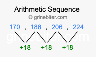 So, what type of sequence is 170, 188, 206, 224? The sequence 170, 188, 206, 224 has a common difference of +18 between each term. We call this kind of sequence an arithmetic sequence. Below is an image illustrating the correlation between the arithmetic sequence 170, 188, 206, 224 and its common difference of +18.