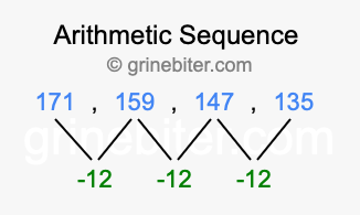 So, what type of sequence is 171, 159, 147, 135? The sequence 171, 159, 147, 135 has a common difference of -12 between each term. We call this kind of sequence an arithmetic sequence. Below is an image illustrating the correlation between the arithmetic sequence 171, 159, 147, 135 and its common difference of -12.