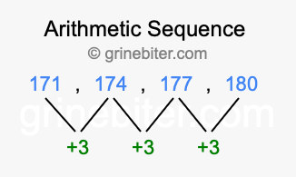 So, what type of sequence is 171, 174, 177, 180? The sequence 171, 174, 177, 180 has a common difference of +3 between each term. We call this kind of sequence an arithmetic sequence. Below is an image illustrating the correlation between the arithmetic sequence 171, 174, 177, 180 and its common difference of +3.