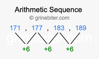 So, what type of sequence is 171, 177, 183, 189? The sequence 171, 177, 183, 189 has a common difference of +6 between each term. We call this kind of sequence an arithmetic sequence. Below is an image illustrating the correlation between the arithmetic sequence 171, 177, 183, 189 and its common difference of +6.
