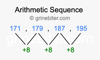So, what type of sequence is 171, 179, 187, 195? The sequence 171, 179, 187, 195 has a common difference of +8 between each term. We call this kind of sequence an arithmetic sequence. Below is an image illustrating the correlation between the arithmetic sequence 171, 179, 187, 195 and its common difference of +8.