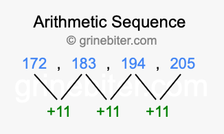 So, what type of sequence is 172, 183, 194, 205? The sequence 172, 183, 194, 205 has a common difference of +11 between each term. We call this kind of sequence an arithmetic sequence. Below is an image illustrating the correlation between the arithmetic sequence 172, 183, 194, 205 and its common difference of +11.