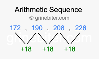 So, what type of sequence is 172, 190, 208, 226? The sequence 172, 190, 208, 226 has a common difference of +18 between each term. We call this kind of sequence an arithmetic sequence. Below is an image illustrating the correlation between the arithmetic sequence 172, 190, 208, 226 and its common difference of +18.