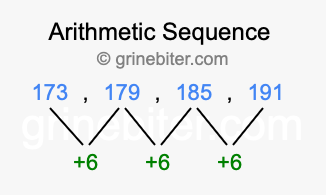 So, what type of sequence is 173, 179, 185, 191? The sequence 173, 179, 185, 191 has a common difference of +6 between each term. We call this kind of sequence an arithmetic sequence. Below is an image illustrating the correlation between the arithmetic sequence 173, 179, 185, 191 and its common difference of +6.