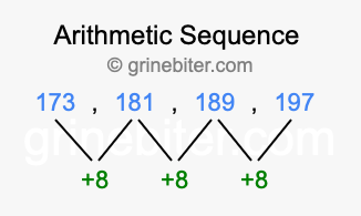So, what type of sequence is 173, 181, 189, 197? The sequence 173, 181, 189, 197 has a common difference of +8 between each term. We call this kind of sequence an arithmetic sequence. Below is an image illustrating the correlation between the arithmetic sequence 173, 181, 189, 197 and its common difference of +8.