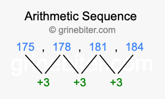 So, what type of sequence is 175, 178, 181, 184? The sequence 175, 178, 181, 184 has a common difference of +3 between each term. We call this kind of sequence an arithmetic sequence. Below is an image illustrating the correlation between the arithmetic sequence 175, 178, 181, 184 and its common difference of +3.