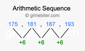 So, what type of sequence is 175, 181, 187, 193? The sequence 175, 181, 187, 193 has a common difference of +6 between each term. We call this kind of sequence an arithmetic sequence. Below is an image illustrating the correlation between the arithmetic sequence 175, 181, 187, 193 and its common difference of +6.
