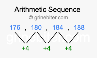 So, what type of sequence is 176, 180, 184, 188? The sequence 176, 180, 184, 188 has a common difference of +4 between each term. We call this kind of sequence an arithmetic sequence. Below is an image illustrating the correlation between the arithmetic sequence 176, 180, 184, 188 and its common difference of +4.