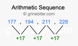 So, what type of sequence is 177, 194, 211, 228? The sequence 177, 194, 211, 228 has a common difference of +17 between each term. We call this kind of sequence an arithmetic sequence. Below is an image illustrating the correlation between the arithmetic sequence 177, 194, 211, 228 and its common difference of +17.