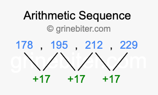 So, what type of sequence is 178, 195, 212, 229? The sequence 178, 195, 212, 229 has a common difference of +17 between each term. We call this kind of sequence an arithmetic sequence. Below is an image illustrating the correlation between the arithmetic sequence 178, 195, 212, 229 and its common difference of +17.