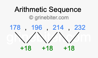 So, what type of sequence is 178, 196, 214, 232? The sequence 178, 196, 214, 232 has a common difference of +18 between each term. We call this kind of sequence an arithmetic sequence. Below is an image illustrating the correlation between the arithmetic sequence 178, 196, 214, 232 and its common difference of +18.