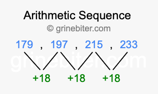 So, what type of sequence is 179, 197, 215, 233? The sequence 179, 197, 215, 233 has a common difference of +18 between each term. We call this kind of sequence an arithmetic sequence. Below is an image illustrating the correlation between the arithmetic sequence 179, 197, 215, 233 and its common difference of +18.