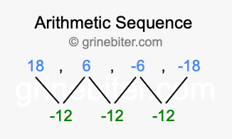So, what type of sequence is 18, 6, -6, -18? The sequence 18, 6, -6, -18 has a common difference of -12 between each term. We call this kind of sequence an arithmetic sequence. Below is an image illustrating the correlation between the arithmetic sequence 18, 6, -6, -18 and its common difference of -12.