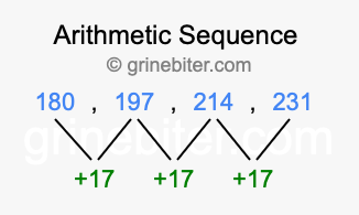 So, what type of sequence is 180, 197, 214, 231? The sequence 180, 197, 214, 231 has a common difference of +17 between each term. We call this kind of sequence an arithmetic sequence. Below is an image illustrating the correlation between the arithmetic sequence 180, 197, 214, 231 and its common difference of +17.