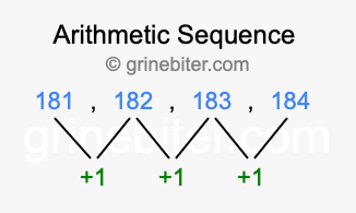So, what type of sequence is 181, 182, 183, 184? The sequence 181, 182, 183, 184 has a common difference of +1 between each term. We call this kind of sequence an arithmetic sequence. Below is an image illustrating the correlation between the arithmetic sequence 181, 182, 183, 184 and its common difference of +1.