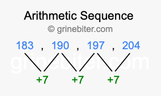 So, what type of sequence is 183, 190, 197, 204? The sequence 183, 190, 197, 204 has a common difference of +7 between each term. We call this kind of sequence an arithmetic sequence. Below is an image illustrating the correlation between the arithmetic sequence 183, 190, 197, 204 and its common difference of +7.