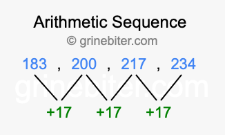 So, what type of sequence is 183, 200, 217, 234? The sequence 183, 200, 217, 234 has a common difference of +17 between each term. We call this kind of sequence an arithmetic sequence. Below is an image illustrating the correlation between the arithmetic sequence 183, 200, 217, 234 and its common difference of +17.