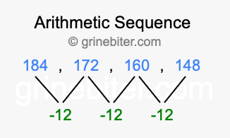 So, what type of sequence is 184, 172, 160, 148? The sequence 184, 172, 160, 148 has a common difference of -12 between each term. We call this kind of sequence an arithmetic sequence. Below is an image illustrating the correlation between the arithmetic sequence 184, 172, 160, 148 and its common difference of -12.