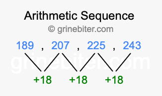 So, what type of sequence is 189, 207, 225, 243? The sequence 189, 207, 225, 243 has a common difference of +18 between each term. We call this kind of sequence an arithmetic sequence. Below is an image illustrating the correlation between the arithmetic sequence 189, 207, 225, 243 and its common difference of +18.