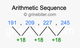 So, what type of sequence is 191, 209, 227, 245? The sequence 191, 209, 227, 245 has a common difference of +18 between each term. We call this kind of sequence an arithmetic sequence. Below is an image illustrating the correlation between the arithmetic sequence 191, 209, 227, 245 and its common difference of +18.
