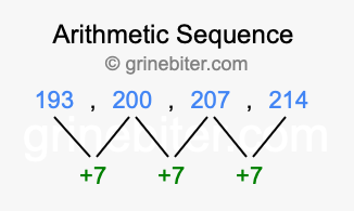 So, what type of sequence is 193, 200, 207, 214? The sequence 193, 200, 207, 214 has a common difference of +7 between each term. We call this kind of sequence an arithmetic sequence. Below is an image illustrating the correlation between the arithmetic sequence 193, 200, 207, 214 and its common difference of +7.