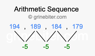 So, what type of sequence is 194, 189, 184, 179? The sequence 194, 189, 184, 179 has a common difference of -5 between each term. We call this kind of sequence an arithmetic sequence. Below is an image illustrating the correlation between the arithmetic sequence 194, 189, 184, 179 and its common difference of -5.