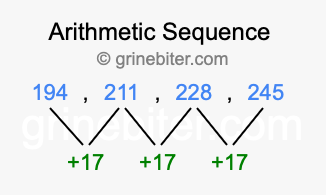 So, what type of sequence is 194, 211, 228, 245? The sequence 194, 211, 228, 245 has a common difference of +17 between each term. We call this kind of sequence an arithmetic sequence. Below is an image illustrating the correlation between the arithmetic sequence 194, 211, 228, 245 and its common difference of +17.