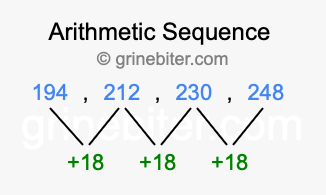 So, what type of sequence is 194, 212, 230, 248? The sequence 194, 212, 230, 248 has a common difference of +18 between each term. We call this kind of sequence an arithmetic sequence. Below is an image illustrating the correlation between the arithmetic sequence 194, 212, 230, 248 and its common difference of +18.
