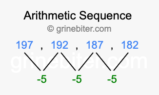 So, what type of sequence is 197, 192, 187, 182? The sequence 197, 192, 187, 182 has a common difference of -5 between each term. We call this kind of sequence an arithmetic sequence. Below is an image illustrating the correlation between the arithmetic sequence 197, 192, 187, 182 and its common difference of -5.