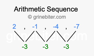So, what type of sequence is 2, -1, -4, -7? The sequence 2, -1, -4, -7 has a common difference of -3 between each term. We call this kind of sequence an arithmetic sequence. Below is an image illustrating the correlation between the arithmetic sequence 2, -1, -4, -7 and its common difference of -3.