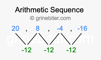 So, what type of sequence is 20, 8, -4, -16? The sequence 20, 8, -4, -16 has a common difference of -12 between each term. We call this kind of sequence an arithmetic sequence. Below is an image illustrating the correlation between the arithmetic sequence 20, 8, -4, -16 and its common difference of -12.