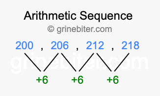 So, what type of sequence is 200, 206, 212, 218? The sequence 200, 206, 212, 218 has a common difference of +6 between each term. We call this kind of sequence an arithmetic sequence. Below is an image illustrating the correlation between the arithmetic sequence 200, 206, 212, 218 and its common difference of +6.