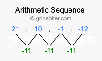 So, what type of sequence is 21, 10, -1, -12? The sequence 21, 10, -1, -12 has a common difference of -11 between each term. We call this kind of sequence an arithmetic sequence. Below is an image illustrating the correlation between the arithmetic sequence 21, 10, -1, -12 and its common difference of -11.