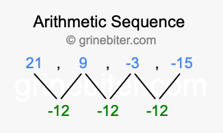 So, what type of sequence is 21, 9, -3, -15? The sequence 21, 9, -3, -15 has a common difference of -12 between each term. We call this kind of sequence an arithmetic sequence. Below is an image illustrating the correlation between the arithmetic sequence 21, 9, -3, -15 and its common difference of -12.