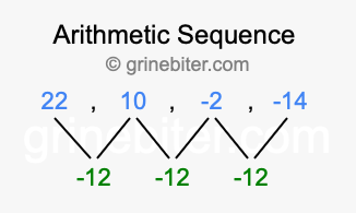 So, what type of sequence is 22, 10, -2, -14? The sequence 22, 10, -2, -14 has a common difference of -12 between each term. We call this kind of sequence an arithmetic sequence. Below is an image illustrating the correlation between the arithmetic sequence 22, 10, -2, -14 and its common difference of -12.