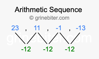 So, what type of sequence is 23, 11, -1, -13? The sequence 23, 11, -1, -13 has a common difference of -12 between each term. We call this kind of sequence an arithmetic sequence. Below is an image illustrating the correlation between the arithmetic sequence 23, 11, -1, -13 and its common difference of -12.
