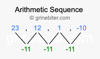 So, what type of sequence is 23, 12, 1, -10? The sequence 23, 12, 1, -10 has a common difference of -11 between each term. We call this kind of sequence an arithmetic sequence. Below is an image illustrating the correlation between the arithmetic sequence 23, 12, 1, -10 and its common difference of -11.