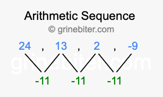 So, what type of sequence is 24, 13, 2, -9? The sequence 24, 13, 2, -9 has a common difference of -11 between each term. We call this kind of sequence an arithmetic sequence. Below is an image illustrating the correlation between the arithmetic sequence 24, 13, 2, -9 and its common difference of -11.