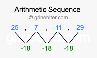 So, what type of sequence is 25, 7, -11, -29? The sequence 25, 7, -11, -29 has a common difference of -18 between each term. We call this kind of sequence an arithmetic sequence. Below is an image illustrating the correlation between the arithmetic sequence 25, 7, -11, -29 and its common difference of -18.