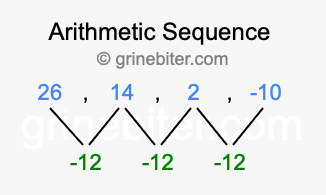So, what type of sequence is 26, 14, 2, -10? The sequence 26, 14, 2, -10 has a common difference of -12 between each term. We call this kind of sequence an arithmetic sequence. Below is an image illustrating the correlation between the arithmetic sequence 26, 14, 2, -10 and its common difference of -12.