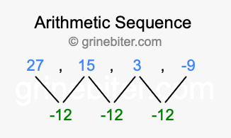 So, what type of sequence is 27, 15, 3, -9? The sequence 27, 15, 3, -9 has a common difference of -12 between each term. We call this kind of sequence an arithmetic sequence. Below is an image illustrating the correlation between the arithmetic sequence 27, 15, 3, -9 and its common difference of -12.
