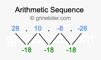 So, what type of sequence is 28, 10, -8, -26? The sequence 28, 10, -8, -26 has a common difference of -18 between each term. We call this kind of sequence an arithmetic sequence. Below is an image illustrating the correlation between the arithmetic sequence 28, 10, -8, -26 and its common difference of -18.